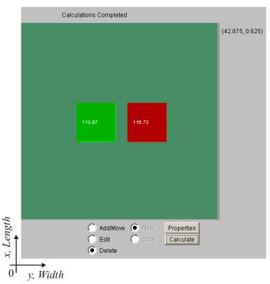 The web tool calculates average temperature rise of each source over the ambient temperature of the fluid at the convectively-cooled lower surface of the substrate. The average source temperature rise is displayed in degrees Celsius on the heat source and, in the case of multiple sources, colours are used to indicate relative magnitude as shown below:
